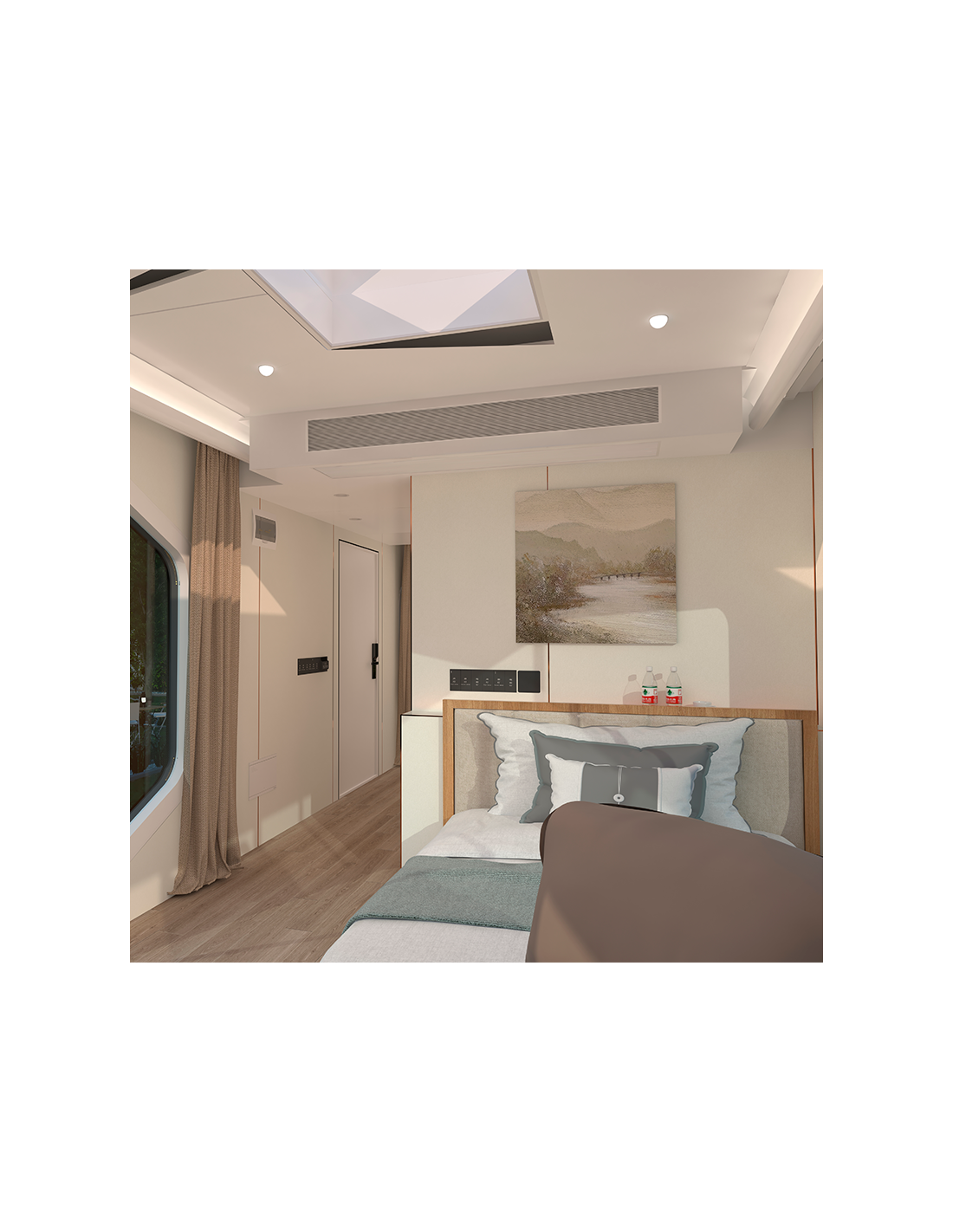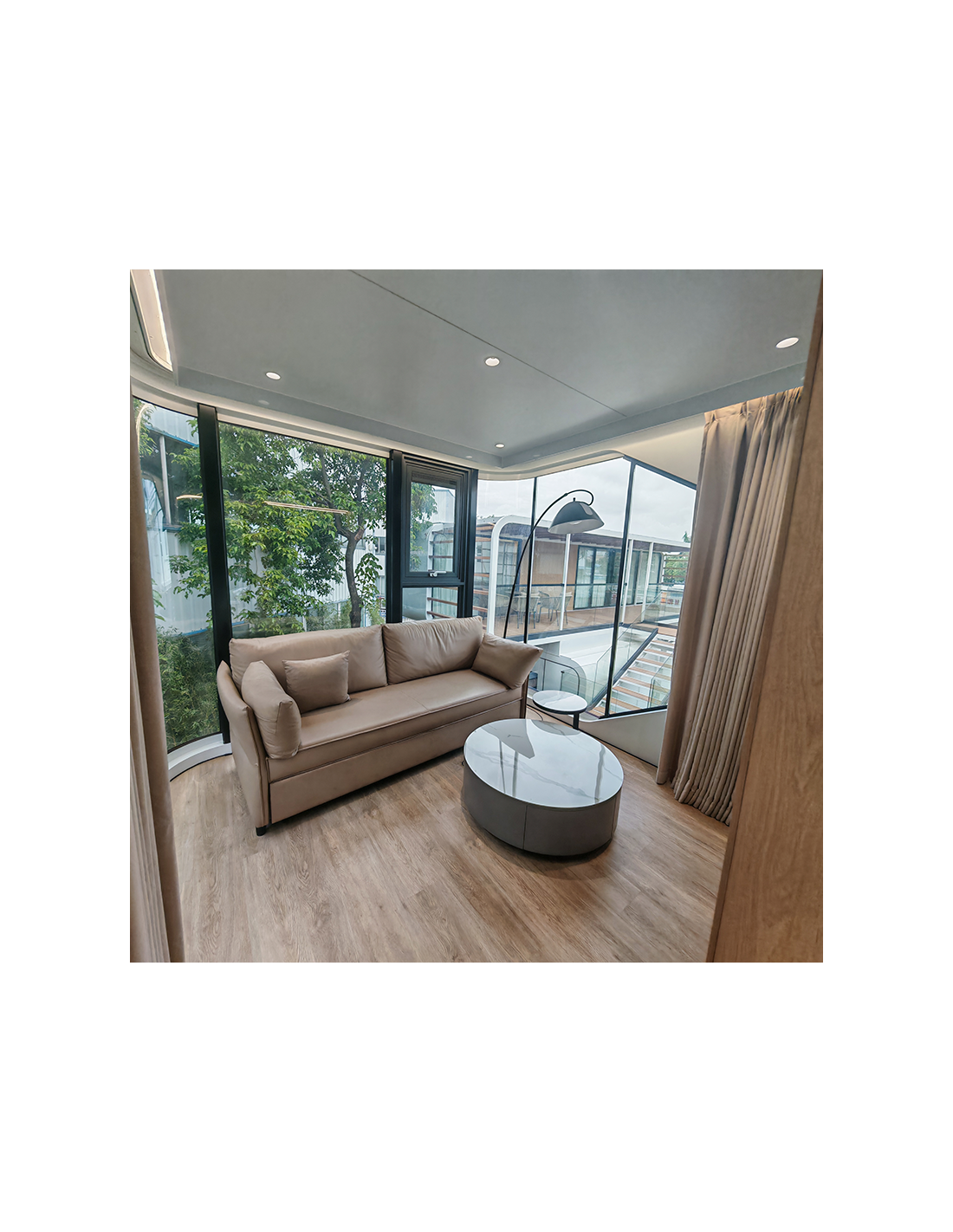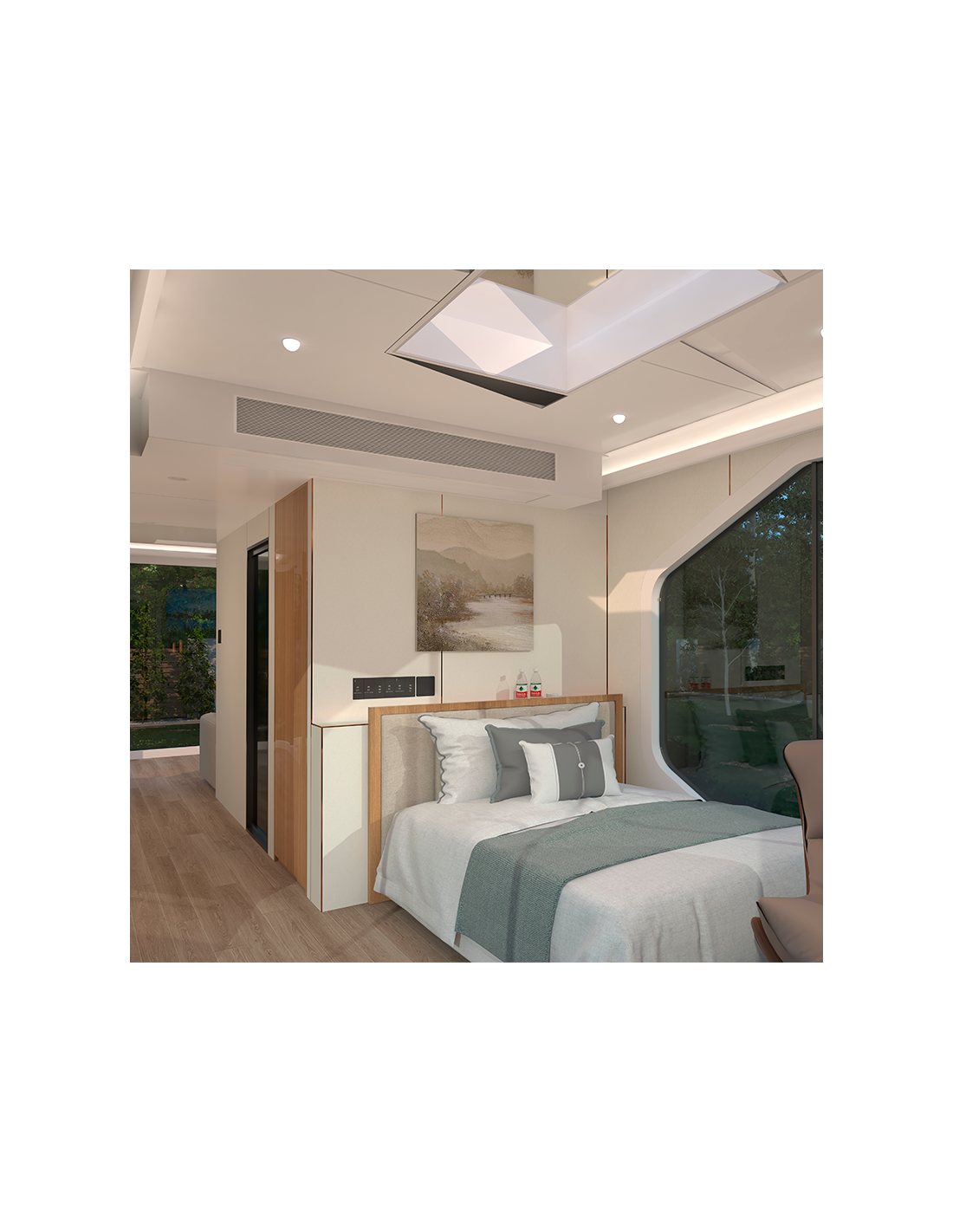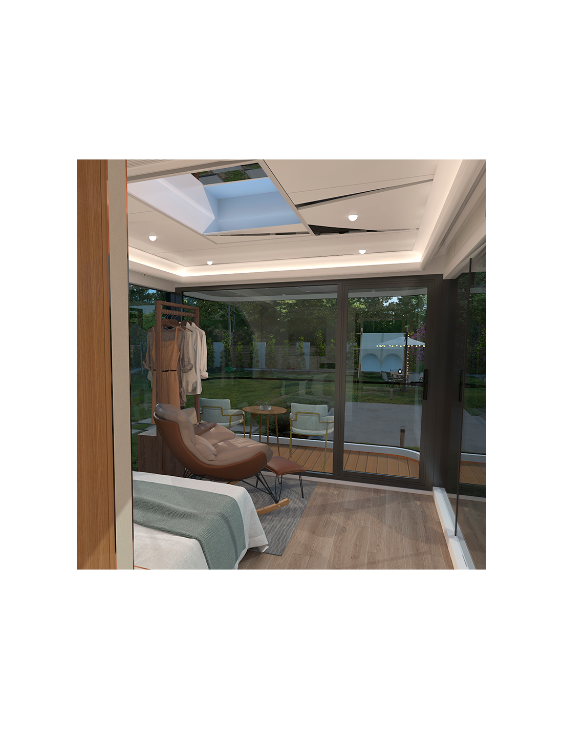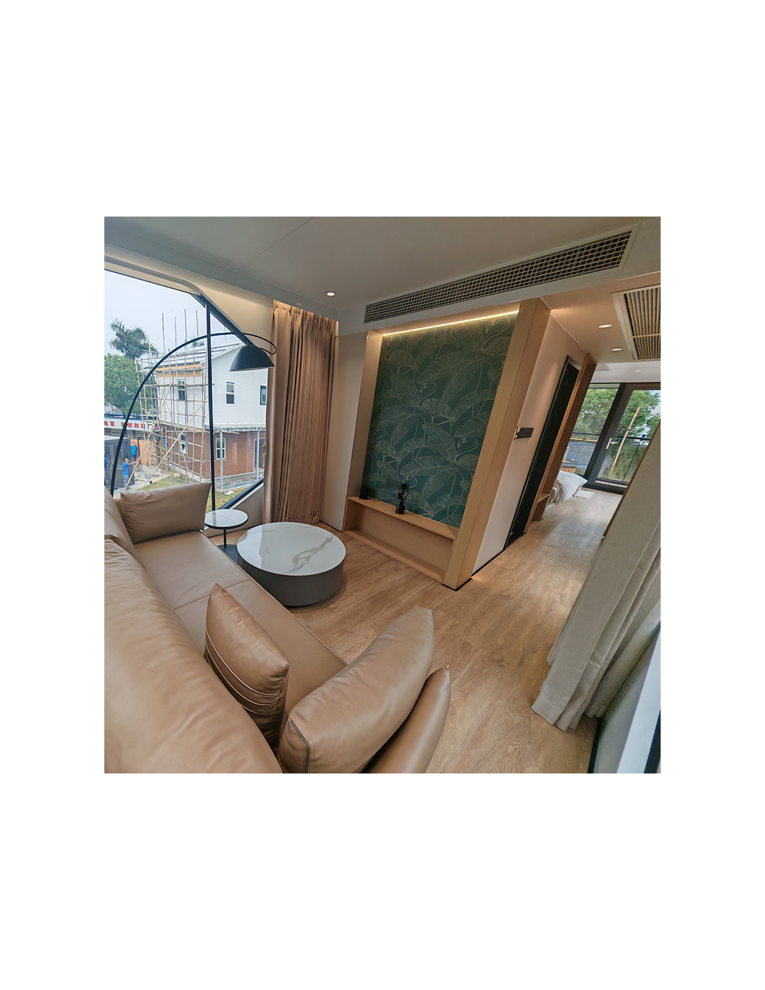 Marco de acero galvanizado por inmersión en caliente | Paredes interiores de paneles ignífugos + paneles integrados de lujo | Control de iluminación LED y cortinas automáticas |